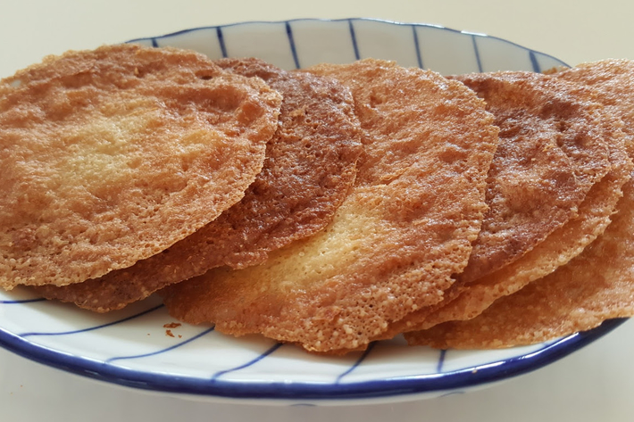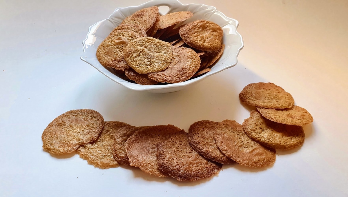 “À défaut de muscovado (désormais en vente, même, dans les Monoprix), de la cassonade courante fera l’affaire. La forte proportion de sucre explique que ces tuiles soient comme de la dentelle.”