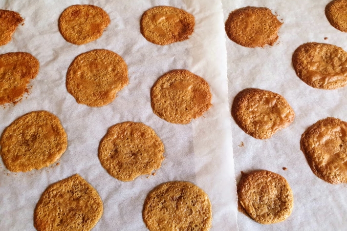 Voici une mise à jour de ces tuiles, moins grandes que précédemment et au muscovado. J’en ai donc obtenu une bonne cinquantaine (et non plus seize avec un diamètre de 8 à 10 centimètres). Mais le muscovado, à la place de la cassonade courante, n’a pas révélé une différence de goût marquante. À vous de voir.