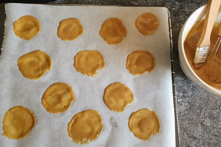 Étalez cette pâte, en cercles de 4 à 5 centimètres de diamètre (ou plus), à l’aide d’un pinceau (et/ou d’une spatule), sur une feuille de papier cuisson posé sur une surface plus rigide.