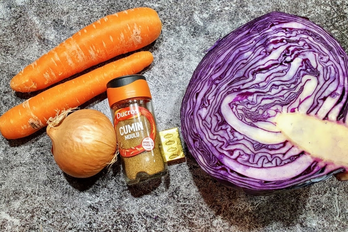 (1) La seconde moitié de chou rouge sera excellente en salade ou dans un autre potage avec 1 betterave crue, 1 pomme fruit, 1 pomme de terre, 1 oignon, un peu de crème liquide et toujours du cumin. Mixez et servez très chaud.