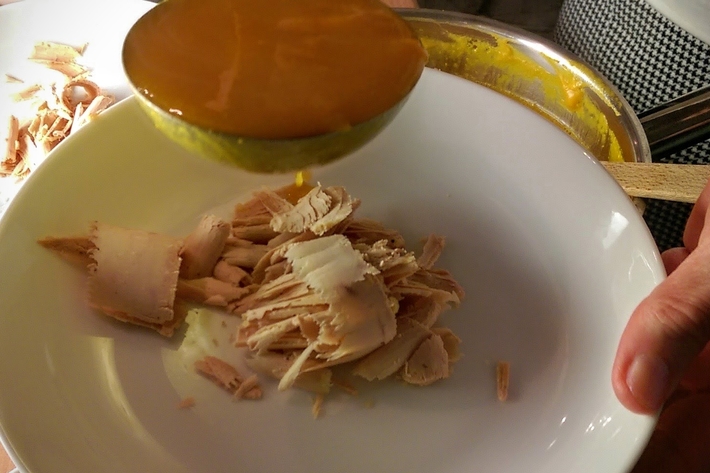 Répartissez le velouté entre les assiettes à soupe par dessus.
