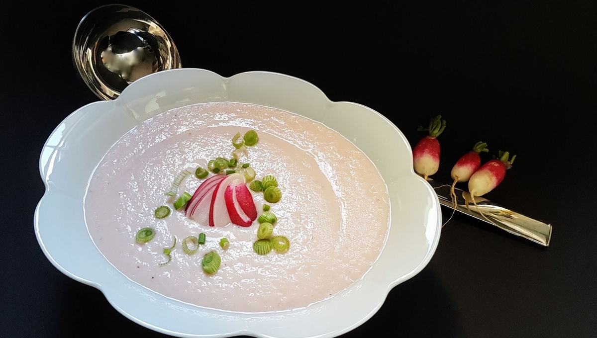 Ce velouté est une merveille de fraîcheur et de délicatesse pour se régaler les jours de chaleur. Faites-vous aider pour le nettoyage ingrat des deux bottes de radis. Le reste, c’est l’enfance de l’art grâce à un bon mixer. Interprété d’après une recette du “Régal” de juillet-août 2018.