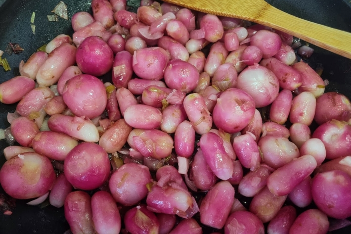 Faites chauffer l’huile dans une grande poêle, ajoutez-y l’oignon et les radis.