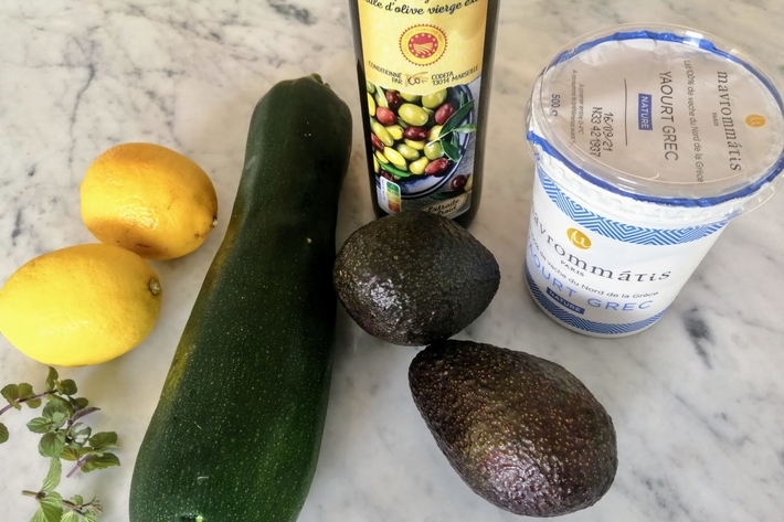 Pelez et coupez les avocats en morceaux. Ajoutez-les aux courgettes avec deux grosses cuillerées à soupe de yaourt grec, les feuilles de menthe et 2 cuillerées à soupe d’huile d’olive.