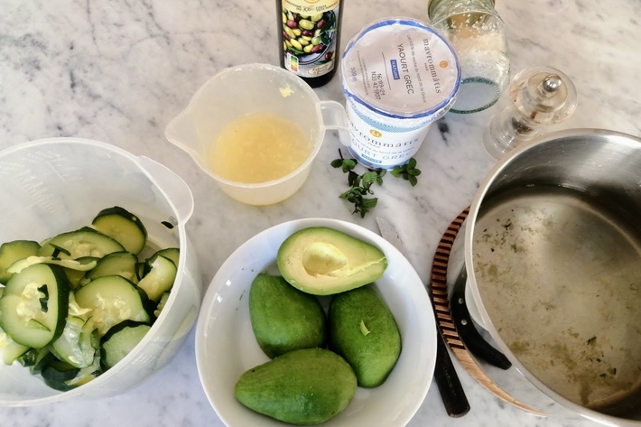 La courgette cuite fait d’excellents veloutés chauds ou froids. Alliée à de l’avocat et du yaourt, elle rend le mélange encore plus onctueux. Et d’une fraîcheur absolue. Pour changer du gaspacho et autres soupes froides.