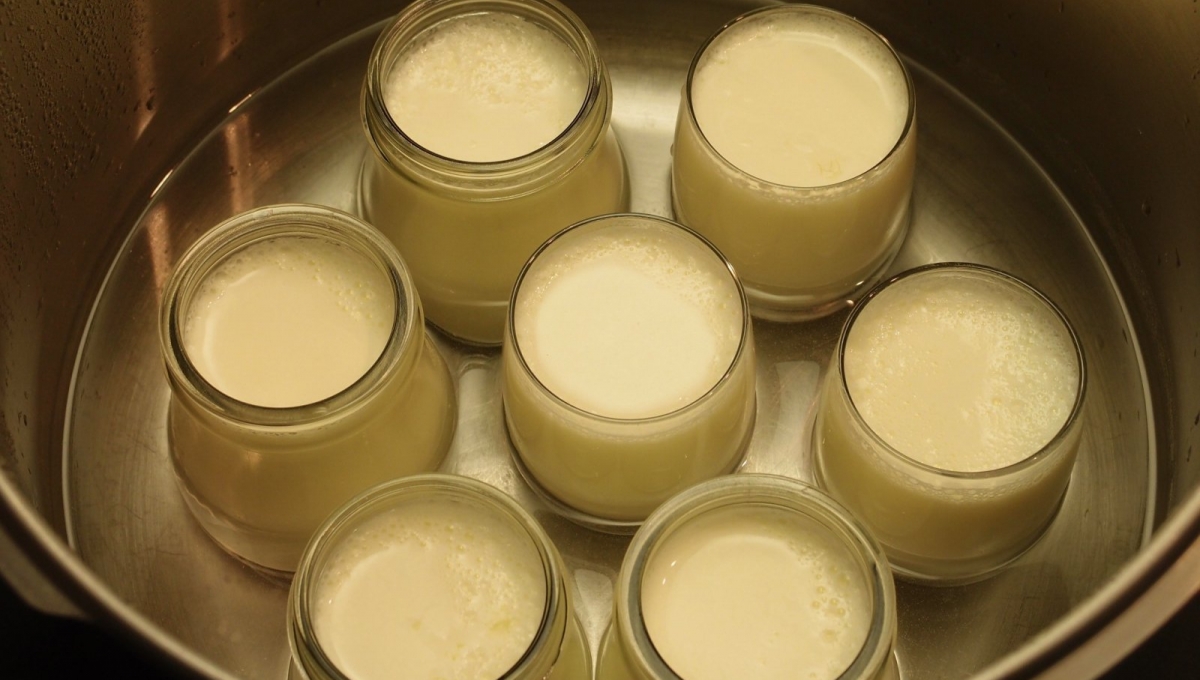 Répartissez le lait dans les pots de verre. Installez-les dans l’autocuiseur dans l’eau (elle sera redescendue à 50°).
